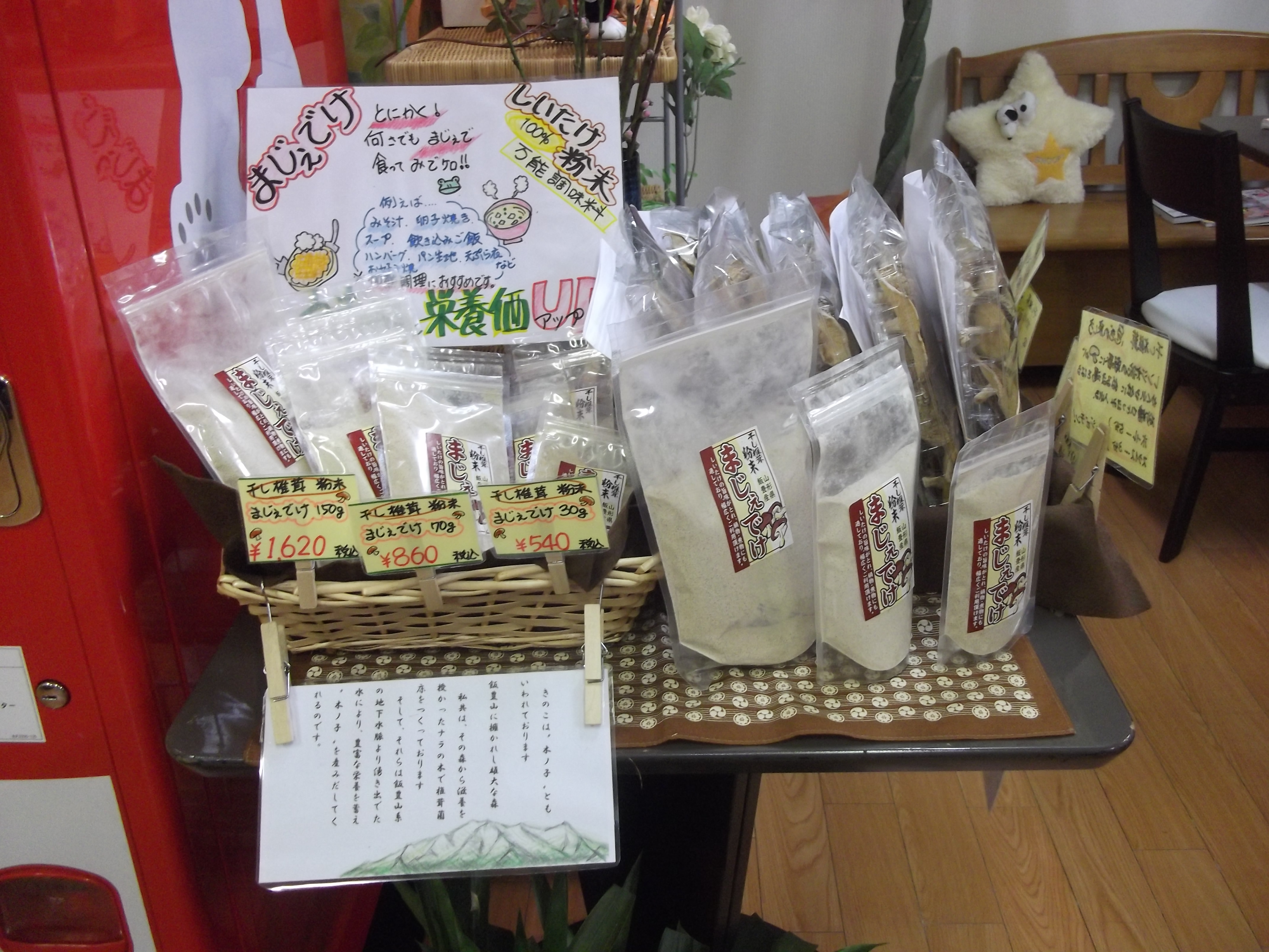 | 今年もお雛様を飾りました。 ご来店される女性のお客様の、健康と美貌と幸せを祈って飾りました。 いらした時には、是非見ていって下さいね。 ![]() 肩こり・腰痛の方に!!! マッサージ機を設置しました。(1回:300円) ・背部を指圧しながら、背骨を伸ばす牽引効果 ・筋肉をほぐし、胃腸の働きを活発にする効果 ・うっ血した肩、首をもみほぐし血液循環の促進効果 ・ふくらはぎをもみほぐし、血流促進効果 ・マイナスイオン発生で、酸性体質→弱アルカリ性体質でドロドロ血のサラサラ効果 飯豊町中津川の干し椎茸と(椎茸の)粉末『まじぇでけ』を 販売しております。 味噌汁・卵焼き・スープ・炊き込みご飯・ハンバーグ・天ぷら衣・お好み焼き・・・などなど何でも『なんでもまじぇでけ』 製造元:やまと林産((株) |