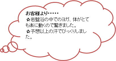 ☆ 毎月 第2・4金曜日 pm7:00~8:00 ☆ 会費 1,800円 ☆ 定員 18名(先着順) 要予約 ☆ 予約は、電話でOK!! ※当日、予約もOK!! ☎ 0238(46)3888 携帯 090-9039-1504 ☆ 準備いただく物 ・お水1㍑(お茶やスポーツドリンクNG) ・服装は、運動しやすいもの(Tシャツ、スパッツやハーフパンツ) ・タオル(バスタオルやフェイスタオル) ☆ 注意事項 ・ 2時間前からは、食事をしないでください。 ※通常の岩盤浴の温度や湿度の中でやるのですか? と聞かれますが、 違います。岩盤の温度や室温、湿度をホットヨガ教室にあわせ、すべて低くしております ので、ご安心ください。 |